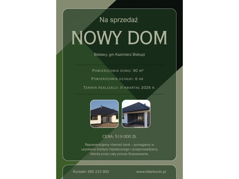 Na sprzedaż nowoczesny dom jednorodzinny w stanie deweloperskim, położony w miejscowości Bielawy, gmina Kazimierz Biskupi. Nieruchomość znajduje się w bardzo spokojnej okolicy, z szybkim dojazdem do Konina oraz w otoczeniu terenów zielonych i rekreacyjnych.