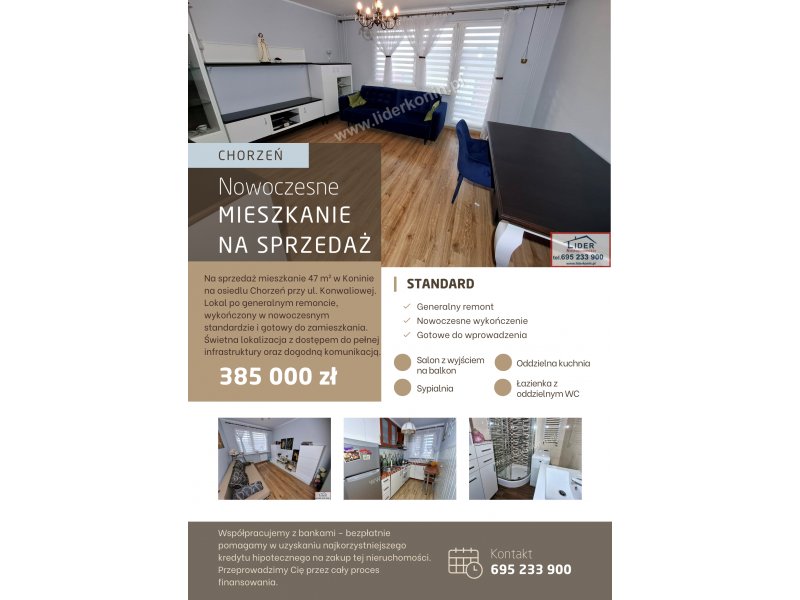 Na sprzedaż wyjątkowe, w pełni rozkładowe mieszkanie o powierzchni 47 m², zlokalizowane w Koninie na cenionym osiedlu Chorzeń przy ul. Konwaliowej.